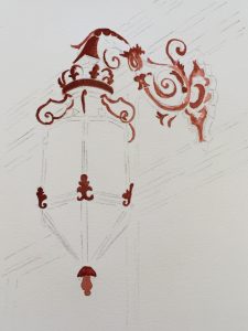 I played around with combinations that would partner the two inspirations in a combined sketch. See the black and white rough shown on the right.