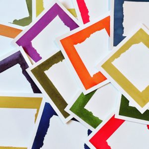 The 5” x 5” paintings are watercolor on paper mounted on 6” x 6” mat boards. They can be displayed as is, or you may choose to re-mat and frame them in some other way.
